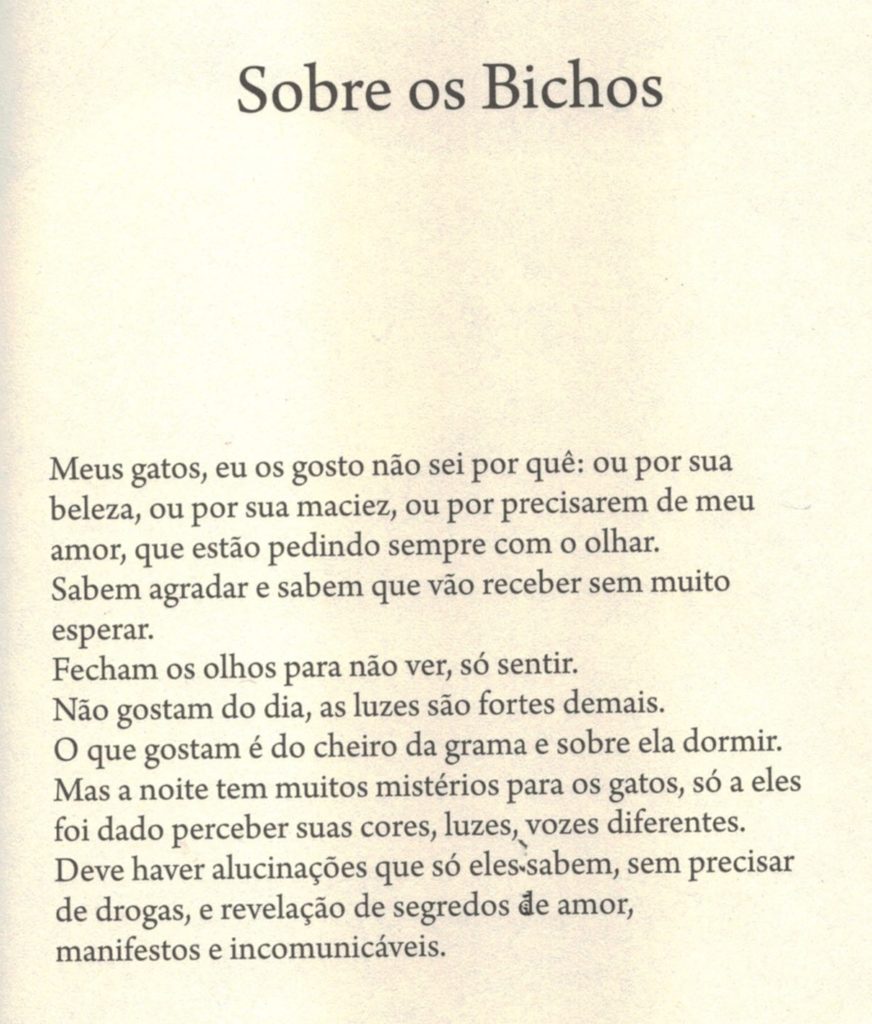 O tema de nossa edição atual é a série de esculturas Bichos, composta por oito obras de cimento branco armado com ferro. Criadas ao longo da década de 1970, possuem estruturas robustas – em contraponto à série Recortes na Paisagem, criada posteriormente – e formas arredondas que brincam com a imaginação do observador, dando liberdade ao visitante para dialogar com as formas de acordo com seus repertórios individuais, suas emoções e estados de espírito, possibilitando diferentes interpretações a cada nova interação. Muito embora as obras já apresentem fendas e vazados que sugerem uma interação com a luz e paisagem locais, elas ainda não se tornaram o discurso central da poética da artista. São, em síntese, formas orgânicas que evidenciam o seu olhar amoroso para os animais – característica que parece ter permeado a sua vida, sendo igualmente revelada em seus poemas, fotografias pessoais e, curiosamente, em seu próprio nome de batismo, originário da língua ídiche: Fayga, que significa pássaro.