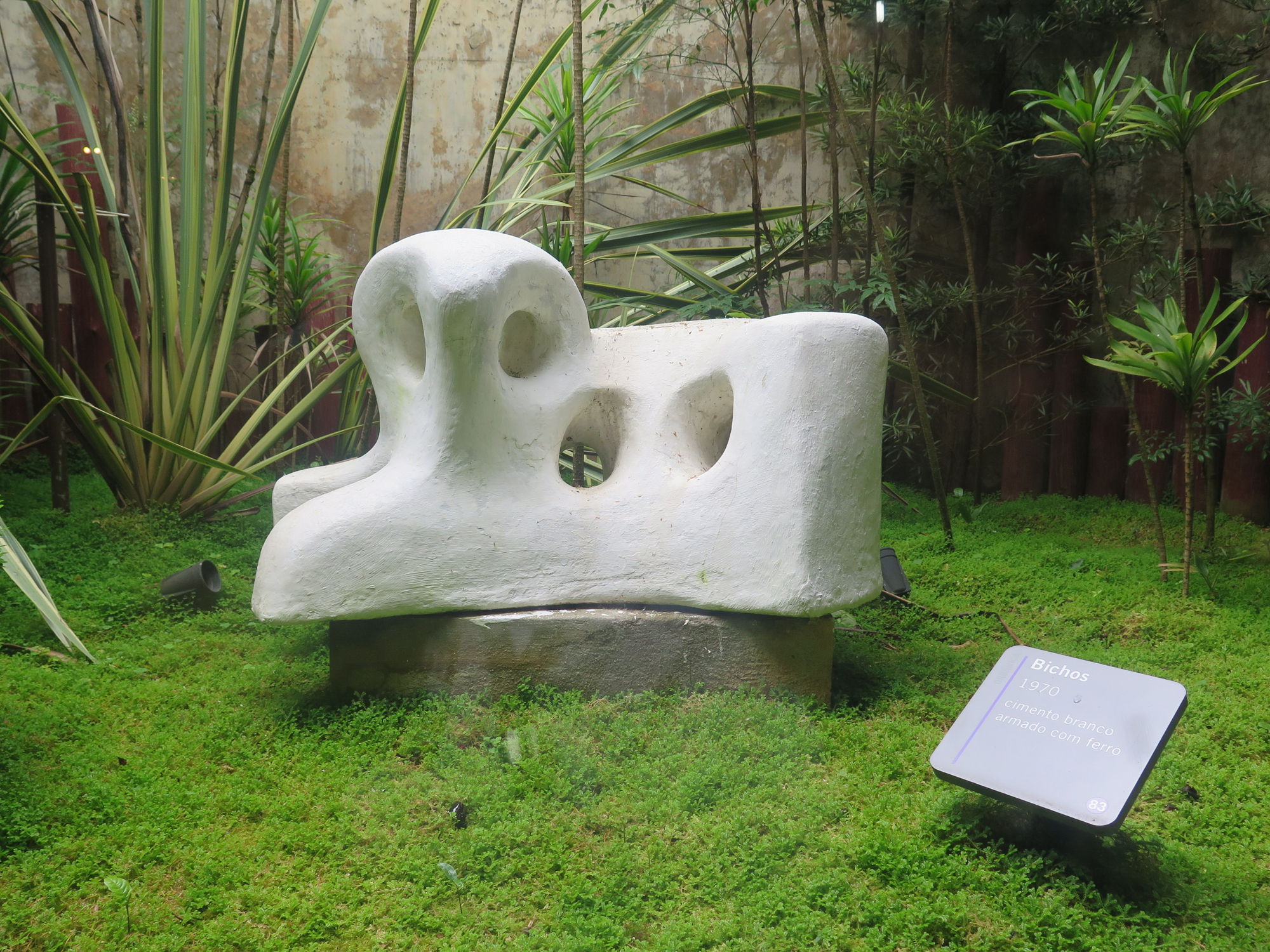A obra Bichos – homônima à série – fica localizada no interior de um jardim de inverno situado no foyer do Auditório Claudio Santoro, criando uma belíssima interação entre os dois equipamentos culturais. Essa área expositiva constitui-se, portanto, num ambiente úmido e com baixa incidência de luz solar, propício ao desenvolvimento rápido de fungos e proliferação intensa de insetos. A escultura O Bicho também está instalada em local diferenciado. Situada ao final da escadaria principal do Museu, ladeando o Auditório, a escultura está cercada por árvores grandes e antigas, o que torna o ambiente mais arejado, porém, ainda assim, com baixa incidência luz solar, provocada pelas copas das árvores. Esta condição expositiva permite a maior incidência de sujidades na escultura, como folhas, frutos, dejetos de pássaros e proliferação acelerada de fungos, exigindo igualmente o acompanhamento atento de suas condições.